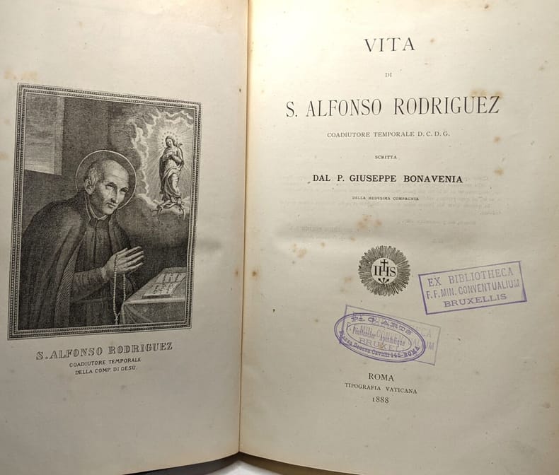 5. Roma, Nella Stamperia di Antonio Boulzaler, 1825, in-4°, 26 x 19,5 cm, viii pp + engraved portrait frontispiece + 186 pp + (2)nn pp ( index), bound in contemporary half leather with marbled boards. Very fine copy with a provenance of a Cornish religious Institute ( stamp on first fly leaf. ) Biography and beatification of Alfonso Rodriguez S.J., one of the first to follow Ignatius of Loyola. Text in Italian.