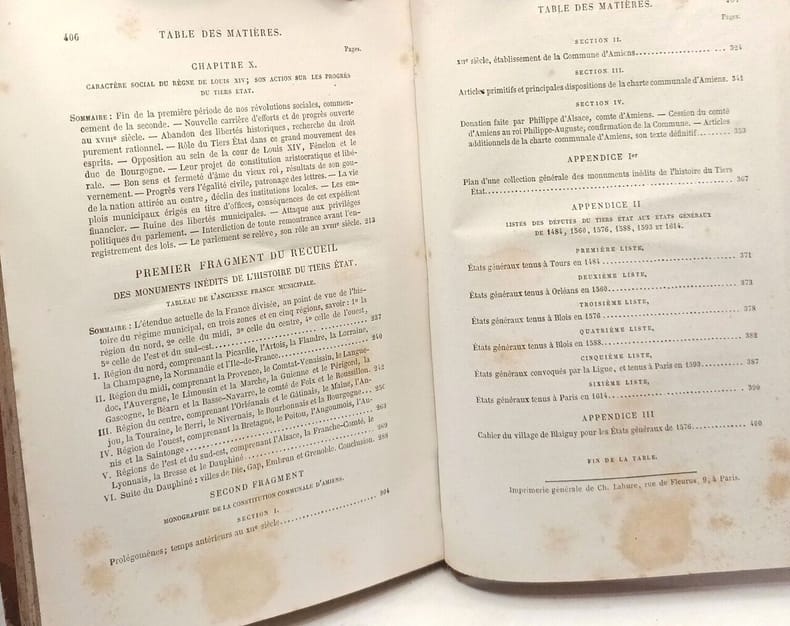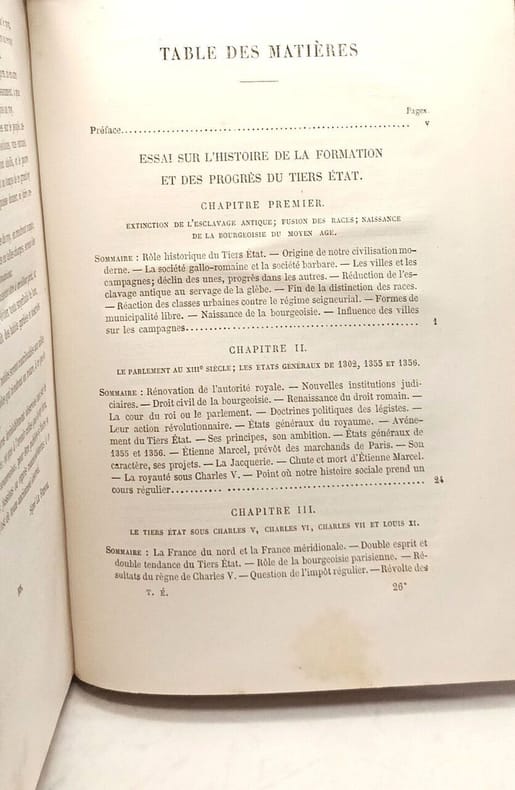 Réédition d'un ouvrage publié en 1853 par Augustin THIERRY (1795-1856): l'histoire du Tiers Etat, du Moyen Age à Louis XIV, en est "la partie principale [...], résumé de tous mes travaux relatifs à la France, composé pour servir d'introduction au "Recueil des monuments inédits de l'histoire du Tiers Etat"" (préface de l'historien de 1853); texte suivi de 2 extraits du "Recueil des monuments inédits de l'histoire du Tiers Etat": "Tableau de l'ancienne France municipale" ("tableau de l'origine et des vicissitudes des anciennes constitutions municipales des villes de France, tracé par régions et par provinces" (préface de l'historien), préface du 2nd volume du recueil) et "Monographie de la constitution communale d'Amiens" (XIIè siècle, avec texte de la charte communale d'Amiens, en latin); textes en appendice, dont la liste des députés du Tiers-Etat aux Etats généraux (1484-1614); notes et références. Volume de l'édition collective posthume des oeuvres de l'historien, avec mention de "nouvelle édition revue avec le plus grand soin".