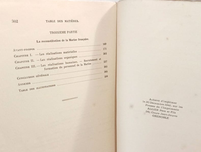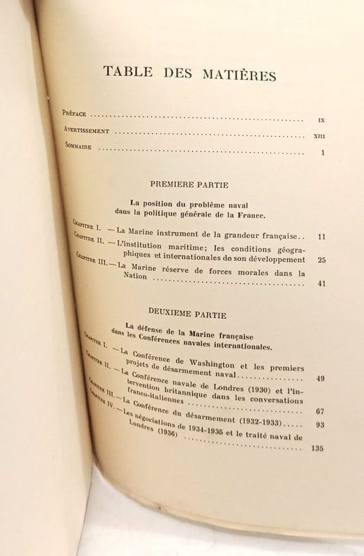 Grenoble, Arthaud, 1941. In-8 broché, XV-302 p. Préface de l'amiral de la flotte F. Darlan. Quelques planches h.t. Table : La position du problème naval dans la politique de la France - La défense de la marine française dans les conférences navales internationales - La reconstitution de la marine française. Bon état.