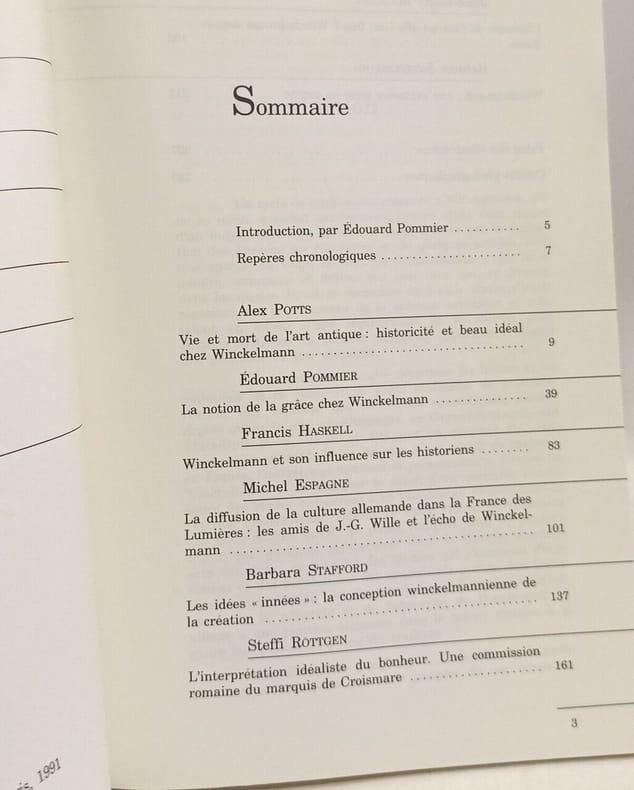 La Documentation Française, Louvre conférences et colloques, Paris, 1989. In-8, broché sous couverture illustrée, 239 pp. Introduction, par Edouard Pommier - Repères chronologiques - Alex Potts : Vie et mort de l'art antique : historicité et beau idéal chez Winckelmann - Edouard Pommier : La notion de la grâce chez Winckelmann - Francis Haskell : Winckelmann ...