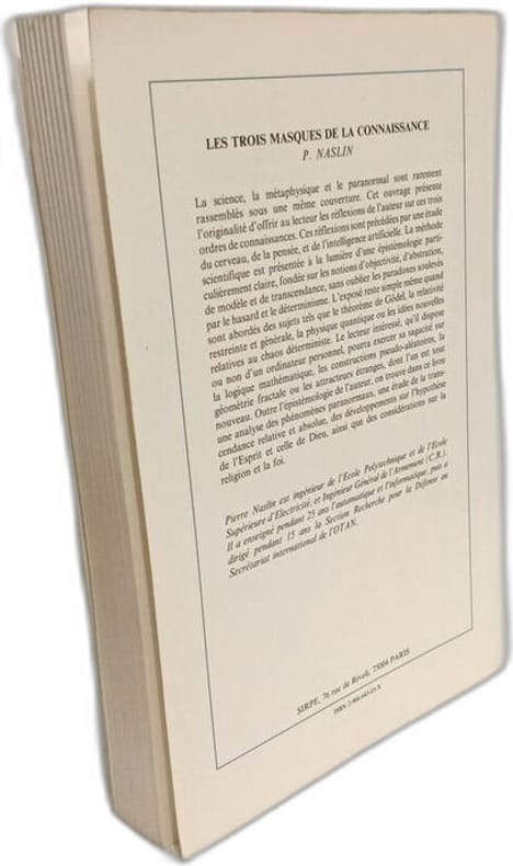 1ere édition Contents, Chapitres : Avant-propos, vi, Texte, 249 pages - Le cerveau et la pensée - L'intelligence artificielle - Les paraconnaissances - Les orthoconnaissances, le réalisme non figuratif - Les paradoxes de l'épistémologie, causalité, hasard, déterminisme, libre-arbitre - De Newton à Einstein, la mécanique déterministe - De Newton à Poincaré, la mécanique chaotique - De Newton à de Broglie, la mécanique probabiliste - Les métaconnaissances laïques, la métaphysique - Les métaconnaissances religieuses, Dieu et les hommes - Bibliographie et index legeres petites taches sur le plat inférieur de la couverture, sinon bon état, intérieur frais, quelques traces d'annotations au crayon effacées
