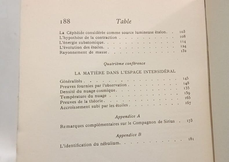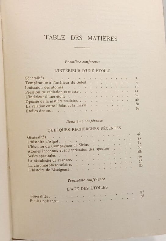 8 planches hors-texte, dont un frontispice, totalisant 12 photographies astronomiques en noir, 1 figure dans le texte (soit un total de 13 illustrations, complet) 1ere traduction française sur la 3eme édition anglaise, 1930 "Contents, Chapitres : Préface de la 1ere édition anglaise, de la seconde édition anglaise, de la 3eme édition anglaise, de l'édition française, avertissement du traducteur, x, Texte, 188 pages - 1. L'intérieur d'une étoile : Généralités - Température à l'intérieur du Soleil - Ionisation des atomes - Pression de radiation et de masse - L'intérieur d'une étoile - Opacité de la matière stellaire - La relation entre l'éclat et la masse - Etoiles denses - 2. Quelques recherches récentes : Généralités - L'histoire d'Algol - L'histoire du Compagnon de Sirius - Atomes inconnus et interprétation des spectres - Séries spectrales - La nébulosité de l'espace - La chromosphère solaire - L'histoire de Bételgeuse - 3. L'âge des étoiles : Généralités - Etoiles pulsantes - La Céphéide considérée comme une source lumineuse étalon - L'hypothèse de la contraction - L'énergie subatomique - L'évolution des étoiles - Rayonnement de masse - 4. La matière dans espace intersidéral : Généralités - Preuves fournies par l'observation - Densité du nuage cosmique - Température du nuage - Preuves de la théorie - Accroissement subi par les étoiles - Appendices : Remarques complémentaires sur le Compagnon de Sirius - L'identification du nébullum - NB : Traduction de ""Stars and Atoms"", Il s'agit de 3 conférences données par Eddington au Congrès d'Oxford de la British Association en août 1926 ainsi qu'une 4eme conférence adjointe aux trois premières et donnée en avril 1929 à la British Broadcasting Corporation (BBC) - Arthur Stanley Eddington, né à Kendal (Cumbria, Angleterre du Nord-Ouest) le 28 décembre 1882 et décédé à Cambridge le 22 novembre 1944 à l'âge de 61 ans, est un astrophysicien britannique, l'un des plus importants du début du xxe siècle. C'est lui qui mit en évidence la limite qui porte son nom, correspondant à la luminosité maximale que peut avoir une étoile d'une masse donnée sans commencer à perdre les couches supérieures de son atmosphère. - Eddington étudia aussi l'intérieur des étoiles et calcula leur température en se basant sur l'énergie nécessaire à contrer la pression exercée par les couches proches de la surface. Ce faisant, il découvrit la relation masse-luminosité des étoiles. Il calcula aussi l'abondance en hydrogène et élabora une théorie expliquant la pulsation des variables céphéides. Le fruit de ses recherches est contenu dans son ouvrage The Internal Constitution of Stars (1926). (source : Wikipedia)" bel exemplaire, le haut du dos de la reliure est un peu frotté sur 1 cm à la coiffe supérieure, la reliure reste en bon état, mors légèrement frottés avec quelques épidermures, intérieur sinon très frais et propre, bien complet des 8 planches hors-texte, infime déchirure sans manque au bas d'une page, cela reste un bel exemplaire