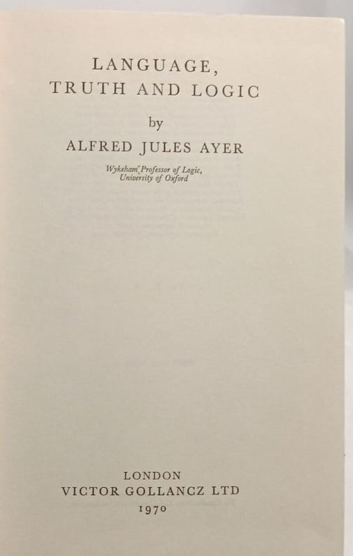 Rare first edition of Ayer's most important and well known work, in which he presents his Verification Principle, which defines a sentence as being meaningful if, and only if, is has a verifiable empirical import. He began writing the book at the young age of 24, and two years later it was published. Ayer is considered a clear and stringent writer. ""Ayer's philosophical ideas were deeply influenced by those of the Vienna Circle and David Hume. His clear, stringent and polemical exposition of them makes ""Language, Truth and Logic"" essential reading on the tenets of Logical Positivism -- the book is regarded as a classic of 20th century analytic philosophy, and is widely read in philosophy courses around the world."" (Wikipedia). The great logical positivist, Sir Alfred Jules Ayer (1910-89), was Grote Professor of Philosophy of Mind and Logic at the University College London from 1946 till 1959, and afterwards he became Wykeham Professor of Logic at the University of Oxford.