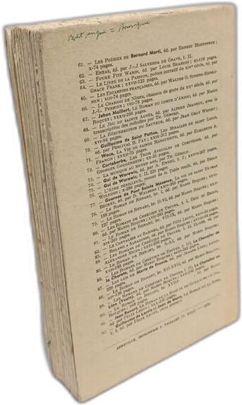 """Les classiques francais du Moyen Age"" - collection sous la direction de Felix Lecoy. Classification Dewey : 840.01-Origines - 1400"
