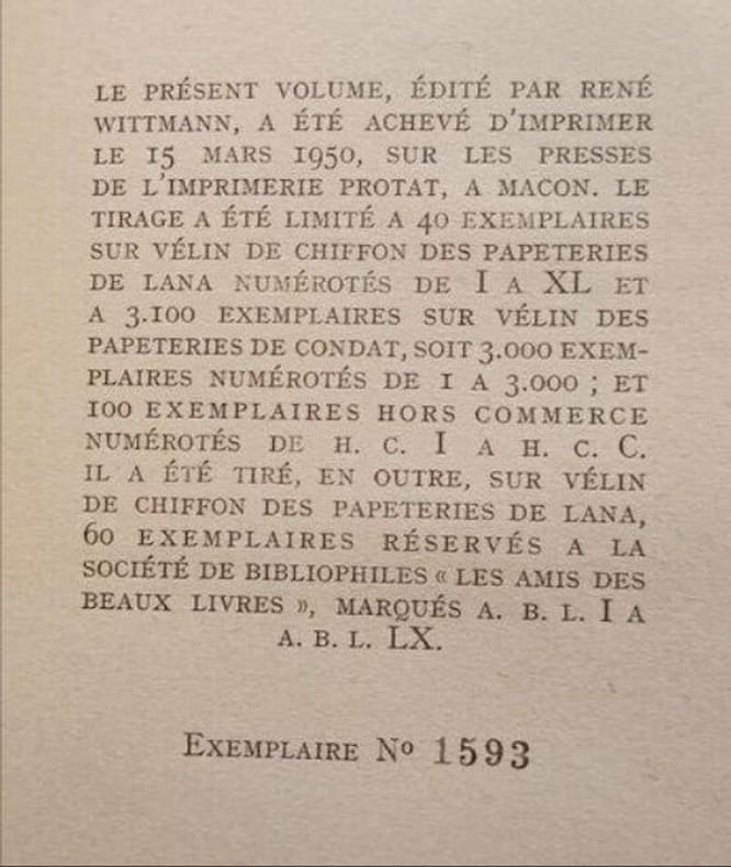 Attention couverture differente de la photo . Tirage special pour les amis des beaux livres . Un des Ex. numerotes A.B.L. XXII/LX sur velin de chiffon des papeteries de Lana. Broche sous jaquette bon etat .Pages non coupees. 187 pages . 1950. Photos sur demande.