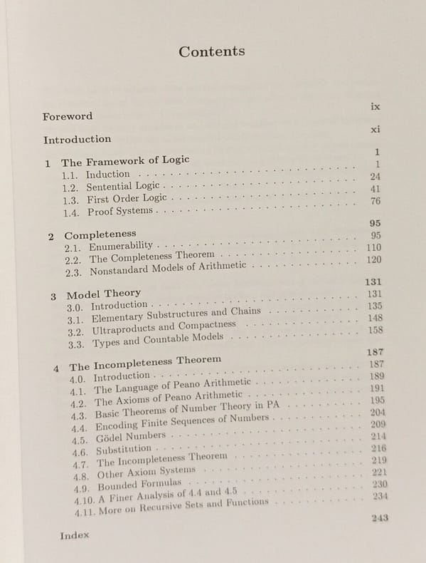 Contents, Chapitres : Contents, Foreword, Introduction, xiii, Text, 247 pages - 1. The framework of logic : Induction - Semantic logic - First order logic - Proof systems - 2. Completeness : Enumerability - The completeness theorem - Nonstandard models of arithmetic - 3. Model theory : Elementary substructures and chains - Ultraproducts and compactness - Types and countable models - 4. The incompleteness theorem : The language of Peano arithmetic - The axioms of Peano arithmetic - Basic theorems of number theory in PA - Econding finite sequences of numbers - Gödel numbers - Substitution - The incompleteness theorem - Other axiom systems - Bounded formulas - A finer analysis of 4.4 and 4.5 - More on recursive sets and functions Near fine copy, no markings