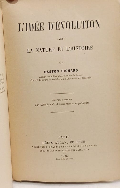 Edition originale dont il n'a pas été tiré de grands papiers. Reliure en demi basane rouge, dos lisse légèrement bruni orné de pointillés dorés comportant de très légères traces de frottements, plats de papier marbré, gardes et contreplats de papier à la cuve, couvertures conservées, reliure de l'époque. Envoi de Gaston Richard à son confrère Mr. Rodier, professeur de philosophie à l'université de Bordeaux. Légères rousseurs affectant uniquement les tranches, sinon rare et agréable exemplaire. - Photographies et détails sur www.Edition-Originale.com -