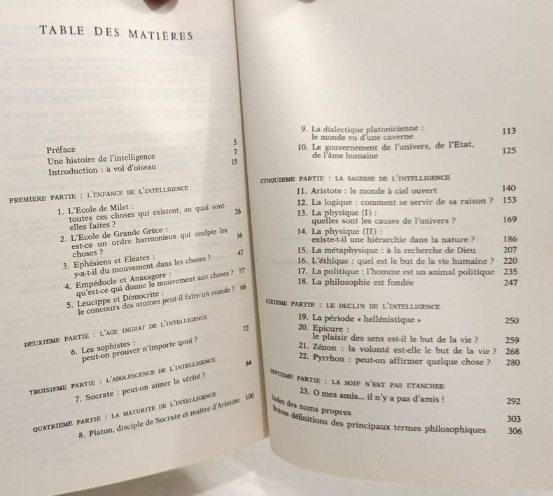 Editions de l'Escalade 1979, in-8 broché, 317 p. (pliures aux plats de couverture, sinon bon état ; épuisé) Première édition ; glossaire et index. Premier tome de cette remarquable synthèse, où le fondateur de l'IPC étudie l'aspiration des Grecs à la sagesse et porte un jugement sur leurs efforts.