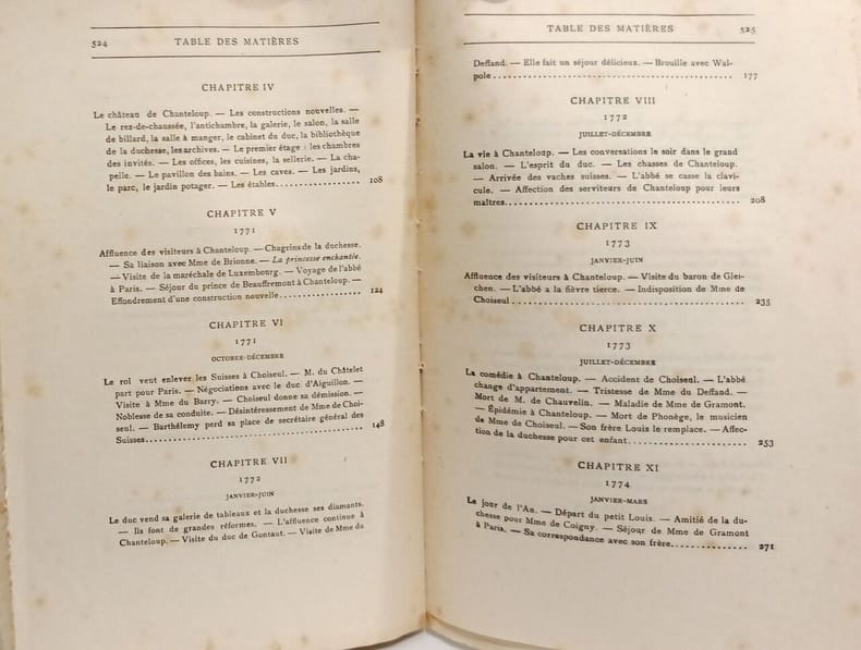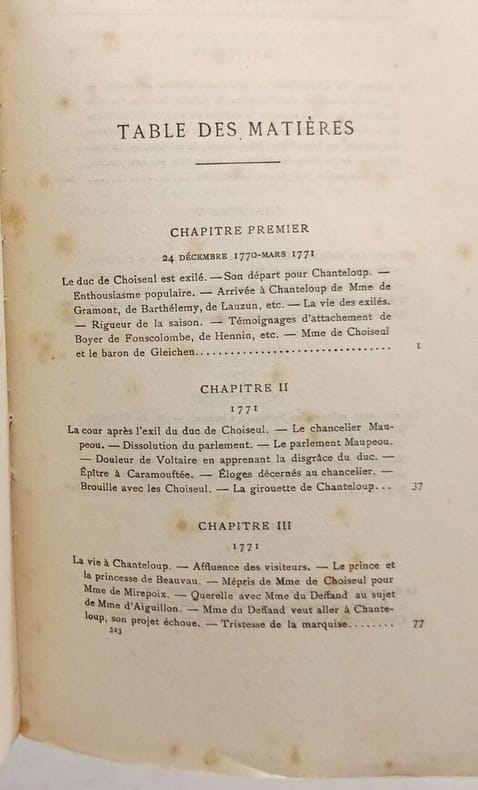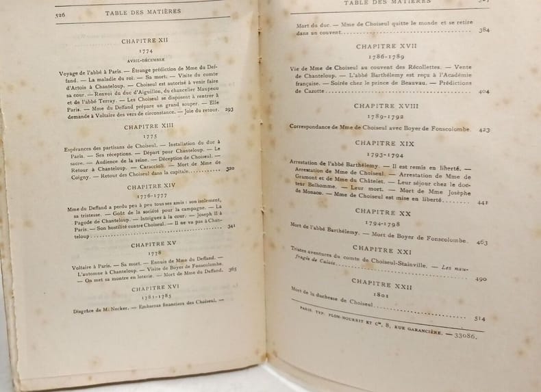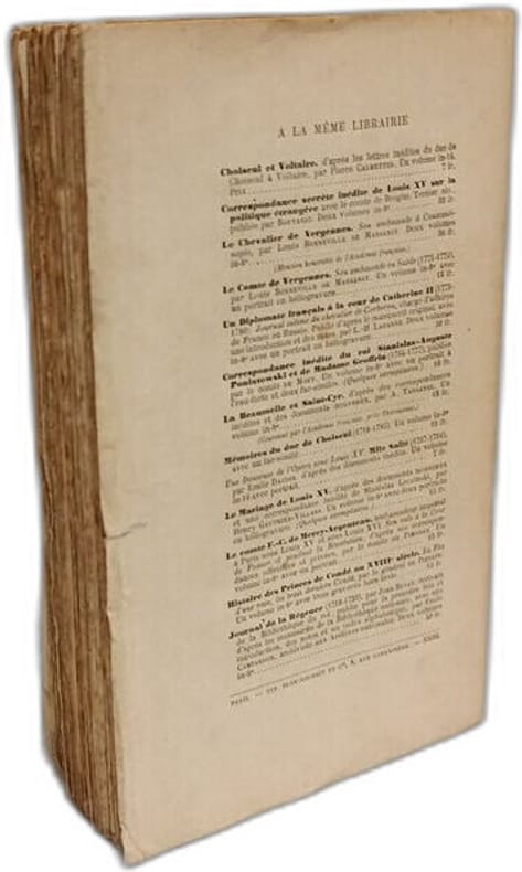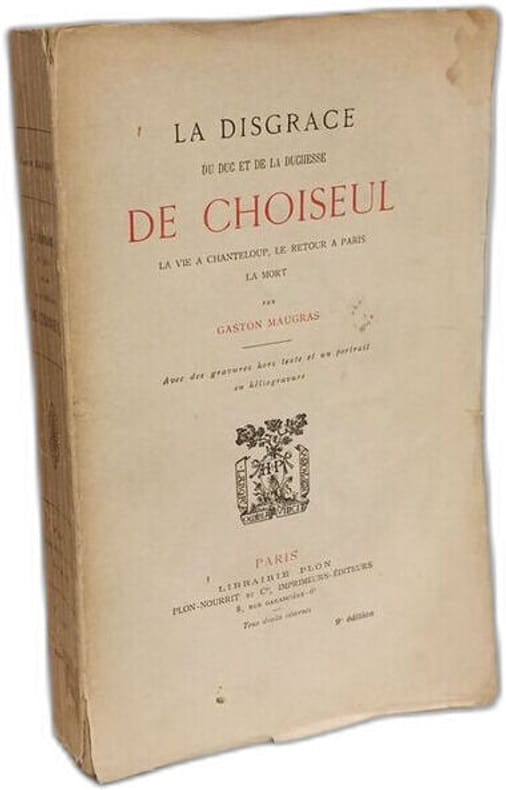 Librairie Plon-Nourrit et Cie 15 x 22,5 Paris 1903 Deux volumes in-8, reliure demi-toile lie de vin, dos lisse avec pièces de titre, titre doré, plats et gardes de papier marbré, tranches jaspées, couvertures conservées Tome I: [4]-VIII-[2]-473 p. portrait en héliogravure de la Duchesse de Choiseul sous serpente en frontispice et gravures hors-texte, cinquième édition. Tome II: 527 p., portrait en héliogravure du Duc de Choiseul sous serpente en frontispice et gravures hors-texte, quatrième édition. Le duc de Choiseul (Nancy, 1719 - Chanteloup, 1785), après avoir été ambassadeur à Rome et à Vienne, fut nommé en 1761 ministre de la Guerre , puis ministre de la Marine. Il dirige la politique extérieure et intérieure de la France jusqu'à sa disgrâce en décembre 1770 et est exilé à Chanteloup. Illustrations en couleurs collées en tête d'ouvrage, intérieur frais. Bon exemplaire.(C113)