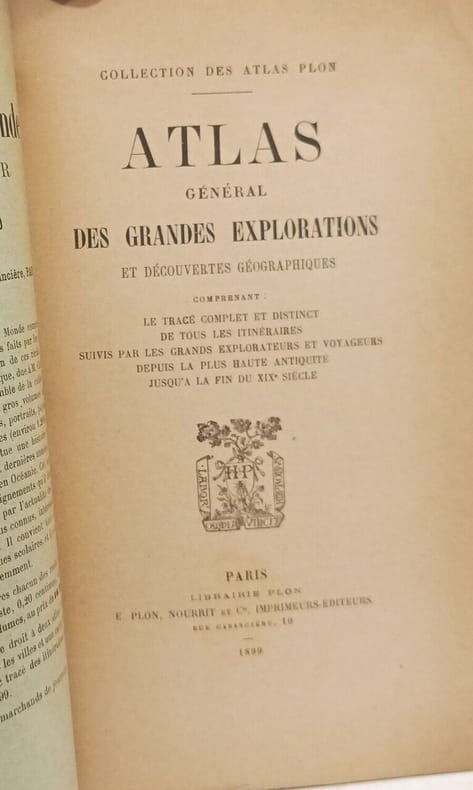 E. Plon 1899 in8. 1899. Broché. Atlas général des grandes explorations et découvertes géographiques comprenant le trace complet et distinct de tous les itinéraires suivis par les grands explorateurs et voyageurs depuis la plus haute antiquité jusqu'à la fin du XIXe siècle