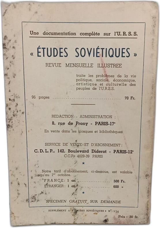 Etudes Soviétiques. 1965. In-8. Broché. Bon état, Couv. convenable, Agraffes rouillées, Intérieur acceptable. 46 pages. Plaquette illustrée de quelques dessins en noir etr blanc dans le texte.. . . . Classification Dewey : 320-Science politique