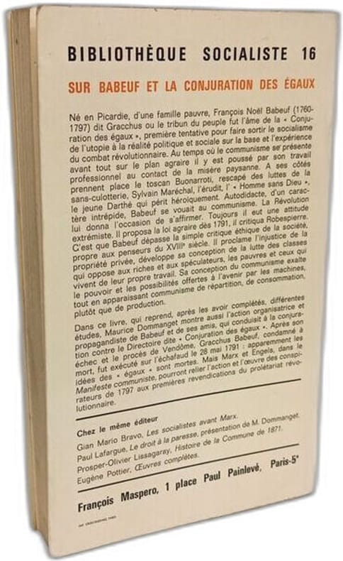 Coll. "Bibliothèque sociale" n° 16, Paris, éd. François Maspero, 1970, in-8, cartonnage souple à rabats, couv. ill. d'un portrait de Babeuf, 392 pp., sommaire, index, bibliographie, table des matières, L'histoire de François Noël Babeuf (1760 - 1797) dit Gracchus ou le tribun du peuple. L'initiateur du socialisme dans le Directoir et aprèss la Révolution française de 1789. Très bon état quelques très petites rousseurs