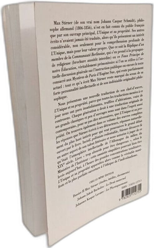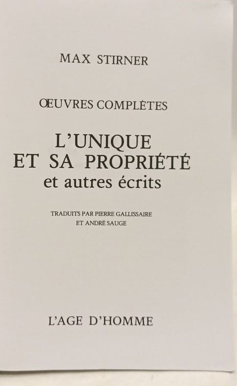 "Collection ""Germanica"" - traduit par P.Gallissaire ('unique et sa propriété) - traduit par A.Sauge (autres écrits). Classification Dewey : 100-PHILOSOPHIE ET DISCIPLINES CONNEXES"