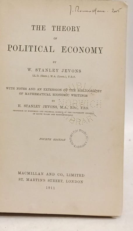 L'édition originale était parue en 1871 et marqua le signal d'une révolution épistémologique dans la discipline économique : en opposition avec David Ricardo et John Stuart Mill, William Stanley Jevons (1835-1892) y soutient que la valeur dépend entièrement de l'utilité, et n'est pas intrinsèque, mais correspond aux besoins des individus. Ce qui le place - mais d'une manière critique - dans la lignée de Bentham et du premier Stuart Mill. - - VENTE PAR CORRESPONDANCE UNIQUEMENT - LIEN DE PAIEMENT, NOUS CONSULTER.
