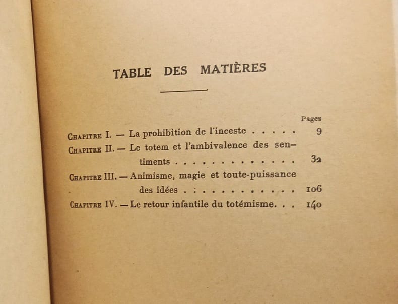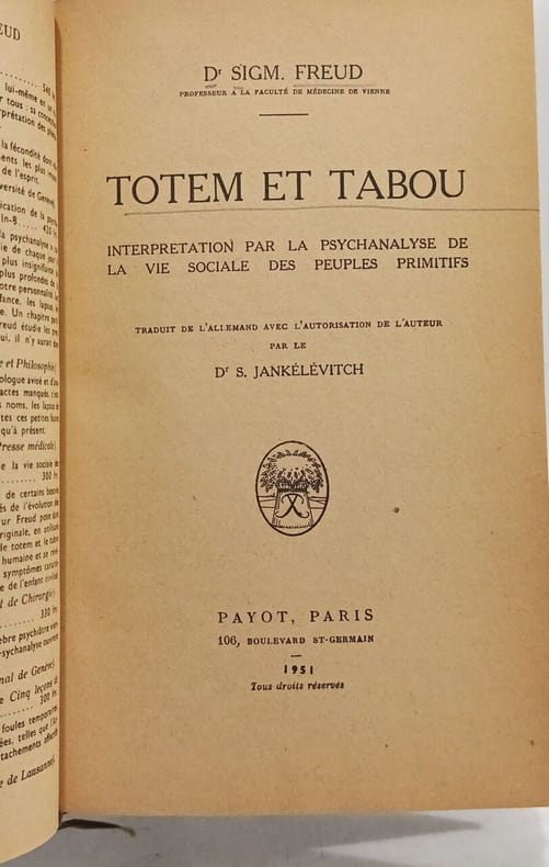 Contents, Chapitres : La peur de l'inceste - Le tabou et l'ambivalence des sentiments - Animisme, magie et toute-puissance des idées - Le retour infantile du totémisme quelques rousseurs sur la couverture, papier uniformement jauni, sinon bon etat - format de poche
