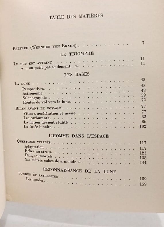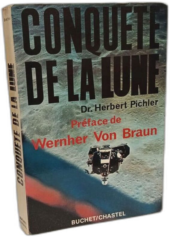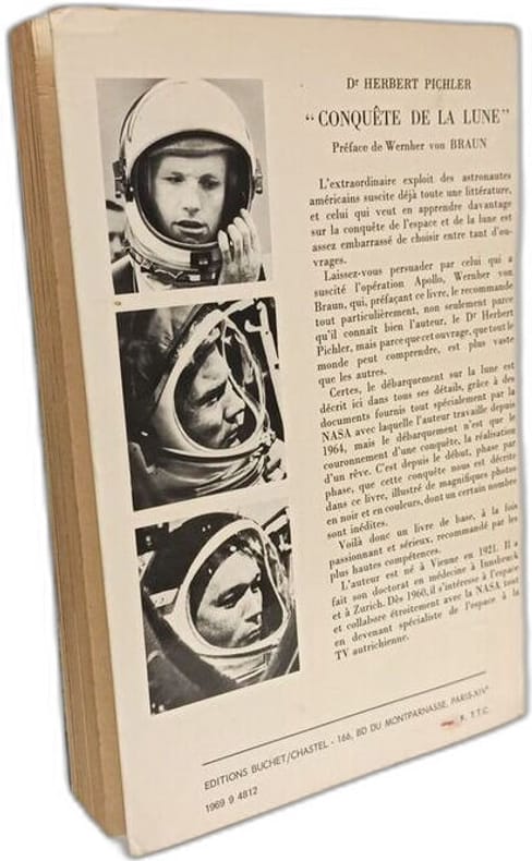 très nombreuses illustrations dans le texte en couleurs, photographies 1ere traduction en français, 1969 Contents, Chapitres : La décision - La victoire - Des hommes, des fusées et des singes - Les pionniers - Les espaces infinies - Deux années d'attente - Le piéton de l'espace - Vingt hommes en vingt mois - Incendie à bord - Noel autour de la Lune - Une Lune américaine ? - Des pas sur la Lune - Postface de Marcel Nicolet - NB : John Arbourg était le journaliste de l'Associated Press chargé des relations avec la NASA jaquette en bon état général, avec plusieurs petites déchirures sur le haut et le bas des plats, très legers petits manques discrets, legere trace d'étiquette au bas du dos (cercle blanc), jaquette tres legerement jaunie, l'intérieur est sinon propre, papier à peine jauni, un numéro au coin supérieur droit de la premiere page, une petite tache bleue discrete sur la page de titres - nb : grand format In-4, relié sous jaquette