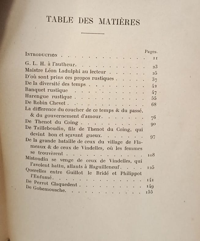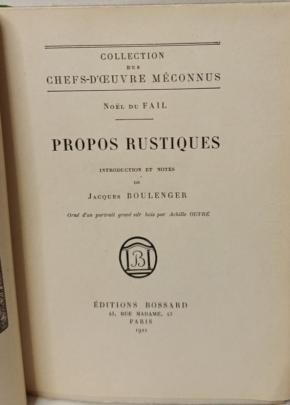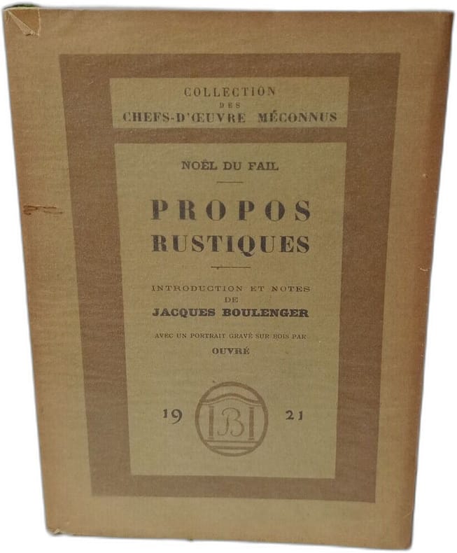 Par Noël du Fail, édition annotée et précédée d'une notice sur Noël du Fail et ses écrits, par Marie Guichard, 1 vol. in-12 reliure demi-chagrin brun, dos à 4 nerfs, Charpentier, Paris, 1856, 2 ff., 413 pp.