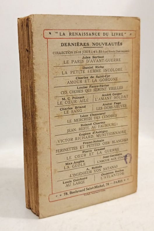 La Renaissance du Livre Broché 1919 In-12 (12,2 x 18,9 cm), broché, 288 pages ; pliures au dos bruni, mors supérieur fendu en tête, volume bruni, par ailleurs assez bon état. Livraison a domicile (La Poste) ou en Mondial Relay sur simple demande.