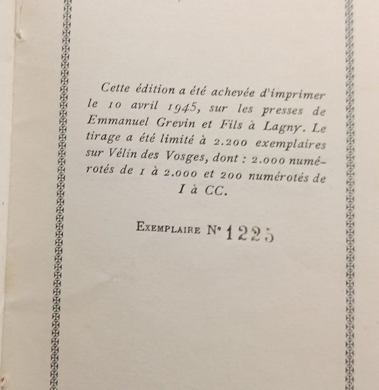 1945 Editions Flammarion - 1945 - In-12, broché, sous papier cristal - 66 pages - Le tirage a été limité à 2200 exemplaires sur Vélin des Vosges dont 200 numérotés de I à CC, ex. N° CXXI