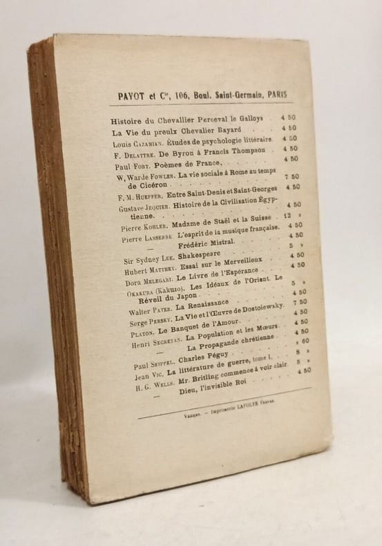 Paris Payot 1918 1 vol. relié 3 textes reliés en un fort in-12, demi-chagrin havane, dos à nerfs, caissons ornés de fleurons dorés, 249, 195 et 230 pp. Bon exemplaire, bien établi. Coiffes légèrement frottées, sinon reliure agréable.