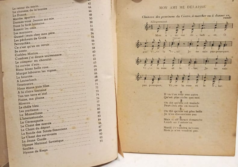 OFFICE GENERAL DES OEUVRES. 1939. In-8. Broché. Etat d'usage, Couv. légèrement passée, Dos abîmé, Intérieur frais. 159 pages. Premier plat illustré en rouge et bleu. Quelques illustrations en noir et blanc dans le texte. Textes et partitions. Manque au dos. Premier plat partiellement détaché.. . . . Classification Dewey : 782.42-Chanson