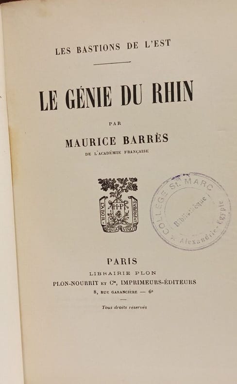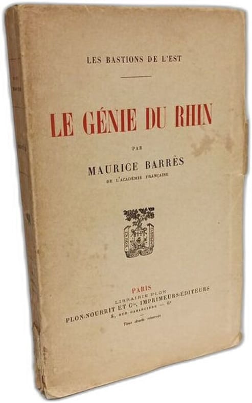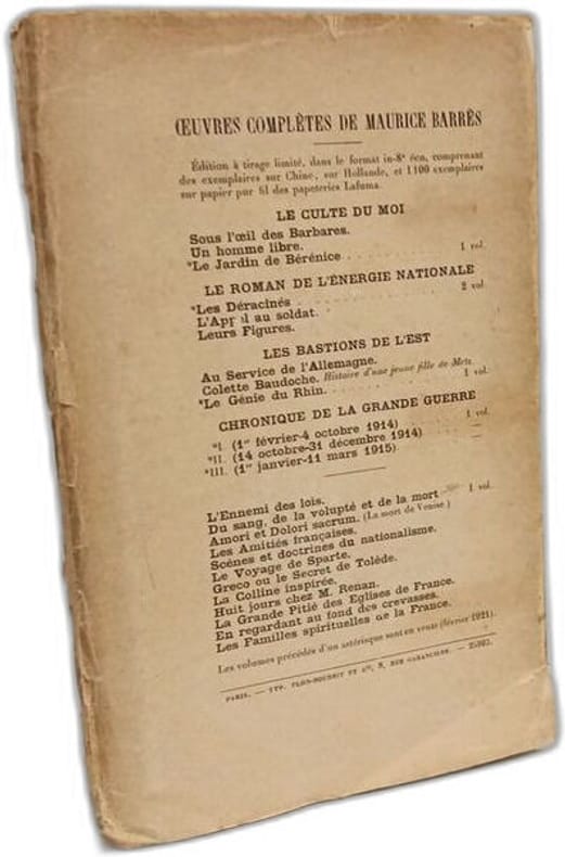 Paris, Plon, 1921 ; in-8, grand papier, 6-XXX-264 pp., broché. Maurice Barrès est né en 1862 à Charmes (Vosges) et mort le 4 décembre 1923 à Neuilly-sur-Seine (Seine), est un écrivain et homme politique français, figure de proue du nationalisme français. Le premier axe de sa pensée est « le culte du Moi ». Il affirme que notre premier devoir est de défendre notre moi contre les « Barbares », c'est-à-dire contre tout ce qui risque de l'affaiblir dans l'épanouissement de sa propre sensibilité. Le second axe est résumé par l'expression « la terre et les morts » qui témoignent de l'évolution de Maurice Barrès vers le nationalisme républicain et le traditionalisme, l'attachement aux racines, à la famille, à l'armée et à la terre natale. Il est resté l'un des maîtres à penser de la droite nationaliste durant l'entre-deux-guerres. Exemplaire numéroté 1093/1100, tiré sur papier pur fil des Papeteries Lafuma.