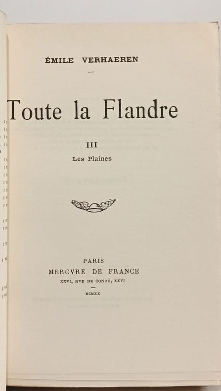 Paris Mercure de France 1920 in 8 (19x13,5) 1 volume broché, 205 pages, non rogné. Toute la Flandre, tome 3 seul: Les plaines. Première édition collective, tirée à 2272 exemplaires numérotés, celui-ci un des 1650 exemplaires numérotés sur papier vergé pur fil des papeteries Lafuma. Bel exemplaire ( Photographies sur demande / We can send pictures of this book on simple request )