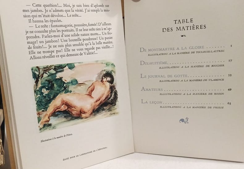 EDITION ORIGINALE. 35 vign., 5 lettres ornées et 5 pl. h.t. en couleurs (exceptées celles de Rodin) de Georges GAUDION, à la manière de... Toulouse-Lautrec, Boucher, Vlaminck, Rodin et Friesz. Deuxième volume de la série "5". Emboîtage éprouvé et fendu, sinon, très bel exemplaire.