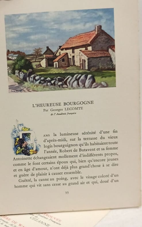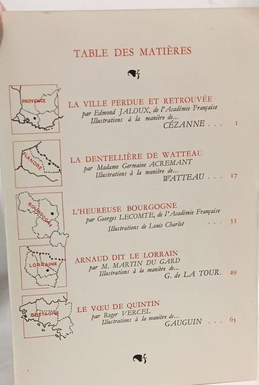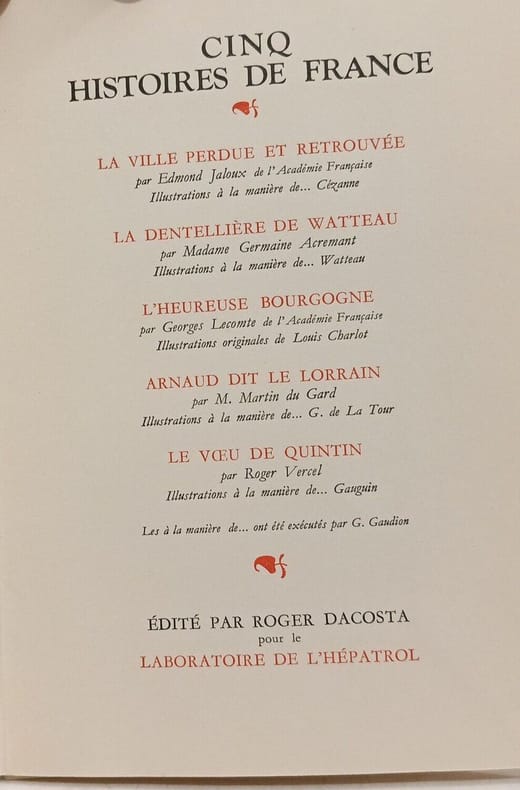 3 vol. in-8 reliure plein chagrin lie-de-vin, Edité par Roger Dacosta, 1938, 1937, 1939, 79, 79 et 79 pp. Titres complets : Cinq Histoires de France [ Avec : ] Cinq Histoires de France [ Avec : ] Cinq Histoires d'Outre-Mer [ Contient : ] Le Testament du Père Bosseleau par Gaston Rageot ; La Greffe par Jean Balde ; Trois Contes de Notre-Dame par Jérôme et Jean Tharaud ; L'invitation à Laurette par Jean Dufourt ; Florence désiré par Maurice Donnay ; La Ville perdue et retrouvée par Edmond Jaloux ; La Dentellière de Watteau par Germaine Acremant ; L'Heureuse Bourgogne par Georges Lecomte ; Arnaud dit Le Lorrain, par Martin du Gard ; Le Voeu de Quintin par Roger Vercel ; Un réveillon dans la Brousse par Louis Bertrand ; Les chercheurs d'Or par Pierre Mille ; Le seigneur-de-la-baie par Jean d'Esme ; Le Paradis perdu par Marius-Ary Leblond
