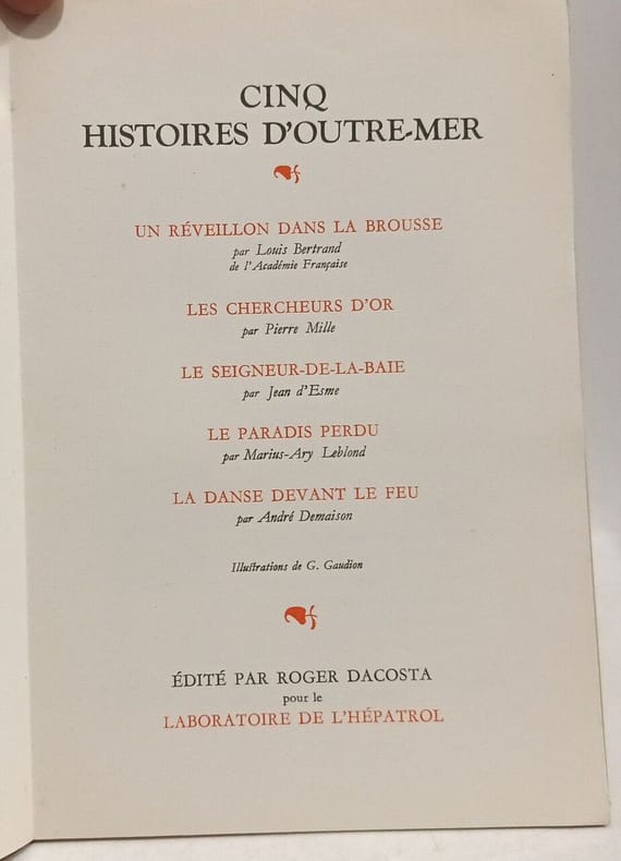 3 titres en 1 vol. in-8 reliure bradel demi-percaline bleue à bande, Edité par Roger Dacosta, 1938, 1937, 1939, 79, 79 et 79 pp. Titres complets : Cinq Histoires de France [ Avec : ] Cinq Histoires de France [ Avec : ] Cinq Histoires d'Outre-Mer [ Contient : ] Le Testament du Père Bosseleau par Gaston Rageot ; La Greffe par Jean Balde ; Trois Contes de Notre-Dame par Jérôme et Jean Tharaud ; L'invitation à Laurette par Jean Dufourt ; Florence désiré par Maurice Donnay ; La Ville perdue et retrouvée par Edmond Jaloux ; La Dentellière de Watteau par Germaine Acremant ; L'Heureuse Bourgogne par Georges Lecomte ; Arnaud dit Le Lorrain, par Martin du Gard ; Le Voeu de Quintin par Roger Vercel ; Un réveillon dans la Brousse par Louis Bertrand ; Les chercheurs d'Or par Pierre Mille ; Le seigneur-de-la-baie par Jean d'Esme ; Le Paradis perdu par Marius-Ary Leblond ; La danse devant le feu par André Demaison
