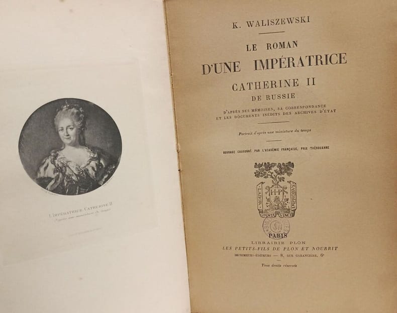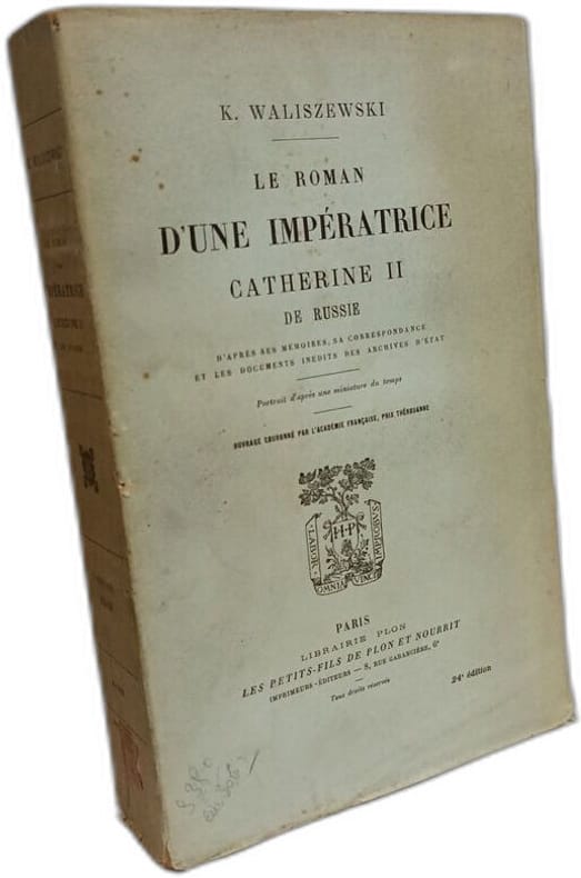 Paru en 1893 et best-seller en son temps, Le Roman d'une impératrice est un ouvrage foisonnant et méticuleux, retraçant en dix-huit chapitres l'itinéraire prodigieux de cette petite princesse d'Anhalt-Zerbst, modeste et cultivée, devenue grande-duchesse de Russie, puis impératrice en 1762, par le tour de force de la destitution puis de la mort de son mari Pierre III. Se fondant largement sur les écrits de Catherine, qui se reconnaissait elle-même graphomane , l'auteur livre un portrait très complet de cette personnalité hors du commun, à la fois figure centrale de l'Europe et, dans son pays, matouchka qui se voulait plus russe et orthodoxe que beaucoup. Même s'il est sous le charme de son héroïne, une femme extraordinaire et une grande souveraine , Waliszewski n'ignore pas ses parts d'ombre : cruelle, despotique, peinant à réformer. Surtout, il fait entendre la voix même de l'impératrice, joyeuse, puissante et passionnée. Le succès du livre, utilisé par tous les biographes ultérieurs de Catherine, provoqua la controverse : comment un Polonais pouvait-il consacrer un travail si considérable à une souveraine qui avait anéanti sa patrie ? Grand in8, 22x19, relié demi cuir, frottements, tranche de tête dorée, auréoles mouillures sèches sur 10 pages ( photo), bon état intérieur, 618pp, couvertures d'origines conservées. Paris,Plon 1897