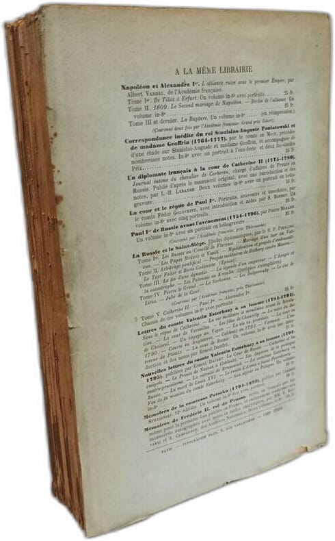 Paris, E. Plon, Nourrit et Cie 1894 In-8 24,5 x 15,5 cm. Reliure demi-chagrin bleu-marine, filets dorés, dos à nerfs encadrés de petits fers dorés, tête dorée, couvertures conservées, portrait de Catherine II en frontispice, XI-618 pp., notes en bas de page, bibliographie, table des matières.