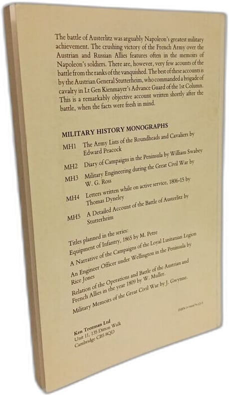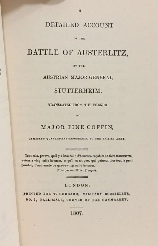 Première traduction anglaise de l'opuscule La Bataille d'Austerlitz par un militaire témoin de la journée du 2 décembre 1805, due au général Karl Daniel Gottfried Wilhelm von Stutterheim (1770-1811), qui avait servi la Saxe et la Prusse pendant les guerres révolutionnaires, mais s'était mis bientôt au service des Habsbourgs (1798) et combattit pour l'Autriche contre l'Empire français tant en 1805 qu'en 1809. Rédigé en français immédiatement après la bataille, publié à Hambourg en 1806, l'ouvrage qui montre la version autrichienne de la plus grande défaite des alliés, rencontra un tel succès, qu'on attribue les annotations des éditions parisiennes à deux autres protagonistes non moins célèbres, Napoléon et Soult.Le traducteur, John Pine Coffin (1778-1830) deviendra en 1819 le commandant en second de Sainte-Hélène sous Hudson Lowe et lui succéda en 1821 comme gouverneur général à la suite de la mort de l'Empereur, puis fut relevé de ces fonctions en mars 1823 lors de la rétrocession de l'île à la Compagnie anglaise des Indes orientales.Aucun exemplaire de cette traduction au CCF. - - VENTE PAR CORRESPONDANCE UNIQUEMENT - LIEN DE PAIEMENT, NOUS CONSULTER.