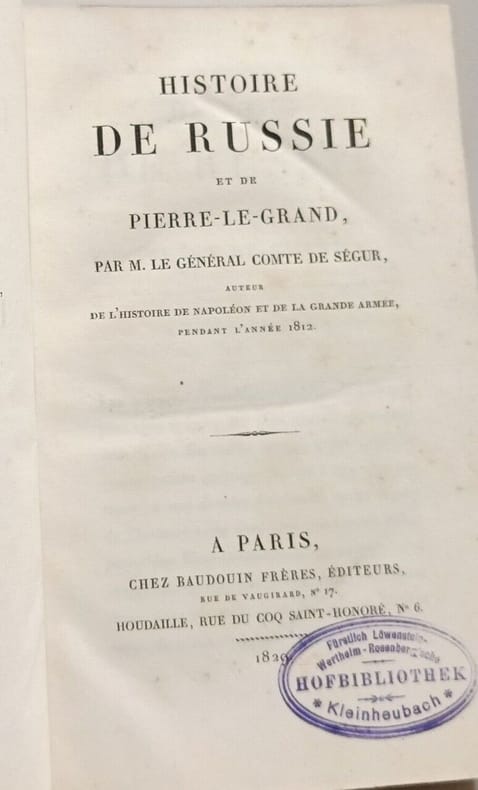 Baudouin Frères / Houdaille, 1829, VIII-583 p., in-8 rel. 1/2 toile, seconde édition, portrait de Pierre-le-Grand en frontispice, une carte dépliante de l'Empire de Russie et de l'Empire d'Autriche in-fine, reliure récente, dos muet, rares rousseurs, tranches marbrées, bon état