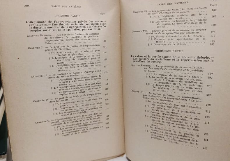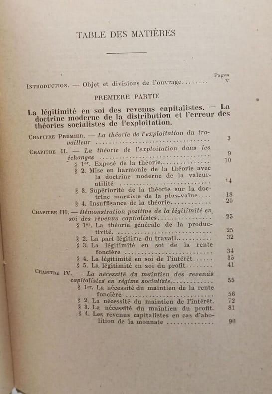 Première partie : La légitimité en soi des revenus capitalistes - La doctrine moderne de la distribution et l'erreur des théories socialistes de l'exploitation. Deuxième partie : L'illégitimité de l'appropriation privée des revenus capitalistes - Une théorie socialiste conciliable avec la doctrine moderne de la distribution: la théorie du surplus social ou de la spoliation par exclusion. Troisième partie : La valeur et la portée exacte de la nouvelle théorie - Les dangers du socialisme et la répercussion sur le problème de justice. Conclusion : Fondements du socialisme et fondements de la politique sociale. Voir le sommaire complet sur photos jointes.