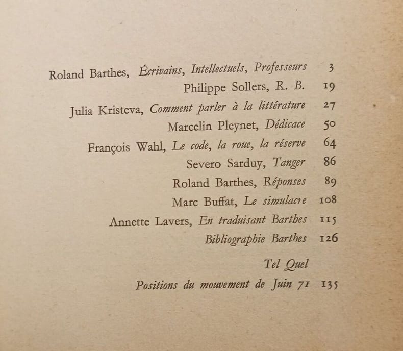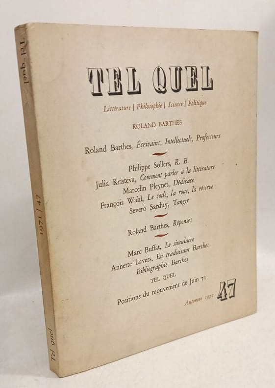 Textes de Roland Barthes - Philippe Sollers - Julia Kristeva - Marcelin Pleynet - François Wahl - Severo Sarduy - Marc Buffat - Annette Lavers et une bibliographie de Roland Barthes. ...................... Photos sur demande ..........................