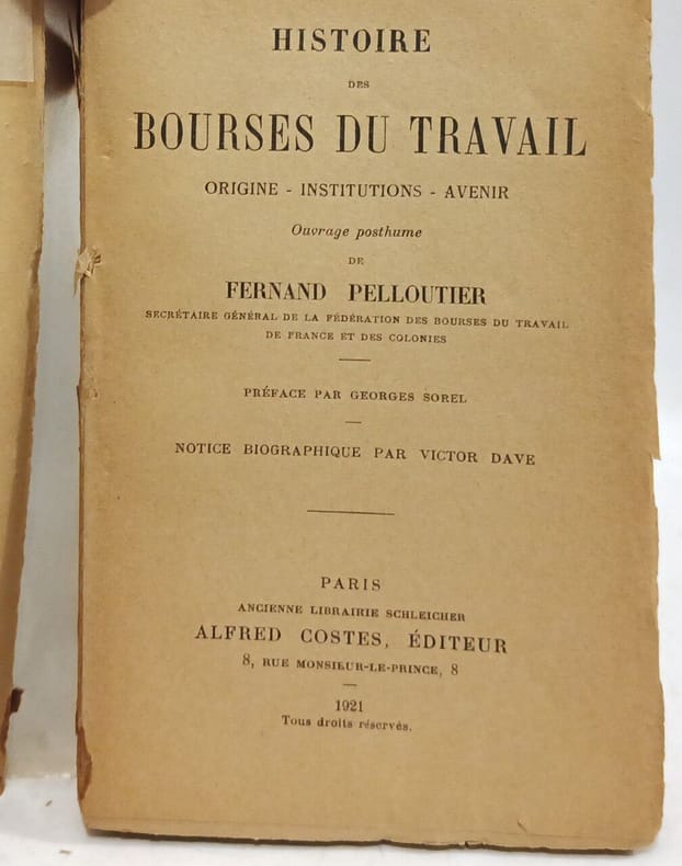 Paris Librairie C. Reinwald, Schleicher Frères, Editeurs 1902 in 12 (18x11,5) 1 volume reliure toilée noire ancienne, dos lisse titré en lettres dorées, avec en queue: Cercle de la Libératrice, portrait en frontispice, XX et 232 pages. Préface par Georges Sorel. Notice biographique par Victor Dave. Fernand Léonce Emile Pelloutier, 1867-1901. Rare. Bon exemplaire ( Photographies sur demande / We can send pictures of this book on simple request )