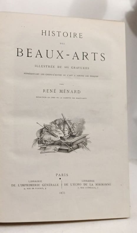 Librairie de l'imprimerie général/Librairie de l'Echo de la Sorbonne. 1875. In-4. Relié demi-cuir. Etat d'usage, Couv. convenable, Dos abîmé, Papier jauni. 516 pages. Nombreuses rousseurs. Coins émoussés, manques, épidermures. 414 gravures en noir et blanc, in et hors texte. Dos passé. Coiffes partiellement arrachées, légers manques, titre, auteur, filets roulettes en doré au dos.. . . . Classification Dewey : 702-Ouvrages divers sur les beaux-arts et les arts décoratifs