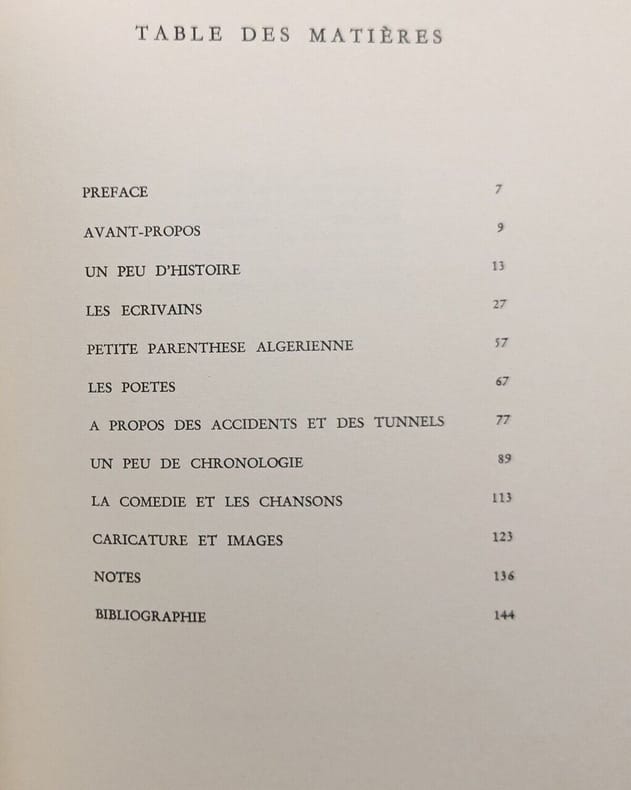 Les écrivains. - Petite parenthèse algérienne. - Les poètes. - A propos des accidents et des tunnels. - La comédie et les chansons. - caricature et images. - Bibliographie. Etc...