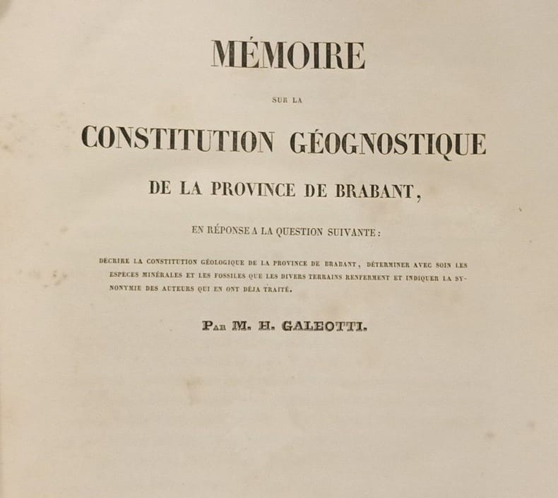in4. Sans date. Cartonné. Memoire sur la constitution geognostique de la province de Brabant en reponse a la question suivante: decrire la constitution geologique de la province de Brabant determiner avec soin les especes minerales et les fossiles que les divers terrains renferment et indiquer la synonymie des auteurs qui en ont deja traite