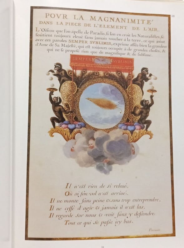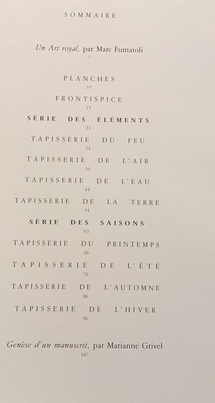 "Devises pour les tapisseries du Roy, où sont représentez les quatre Éléments et les quatre Saisons de l'année", par Charles Perrault, François Charpentier et Jacques Cassagne, peintures de Jacques Bailly. Les planches sont précédées par "Un Art royal" de Marc Fumaroli et suivies par "Genèse d'un manuscrit" de Marianne Grivel. Voir le sommaire sur photos jointes.