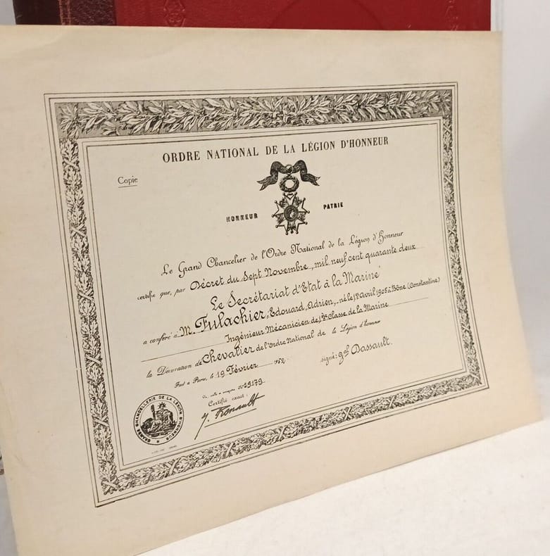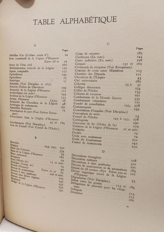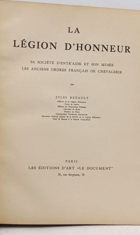 Paris Les Editions d'Art '' Le Document '' 1934 grand in 4 (33,5x26,5) 1 volume reliure demi chagrin vert de l'éditeur, dos à nerfs orné dun décor à froid, et d'un fleuron doré de l'ordre de la légion d'honneur, plats recouverts de percaline verte et ornés d'un décor d'encadrement estampé à froid, le plat supérieur est orné au centre d'un fer doré de l'ordre de la légion d'honneur, 354 pages [1], avec de nombreuses illustrations en noir et blanc et en couleurs et des fac-similés (73 planches hors-texte, papier Vélin de Navarre), avec une planche hors-texte montée sur onglet: Diplôme de nommination à l'ordre de Mr. B. fait à Paris en 1933, signé par le chef du 1er bureau: M. Renault. Edition refondue et augmentée de l'édition princeps, parue en 1922 et renouvellée en 1924, en 1925 et en 1930. Création de la légion d'honneur; Organisation actuelle; Devoirs, droits, préséances, honneurs, privilèges; L'ordre souverain de Malte et les anciens ordres français de chevalerie. Bon exemplaire ( Photographies sur demande / We can send pictures of this book on simple request )