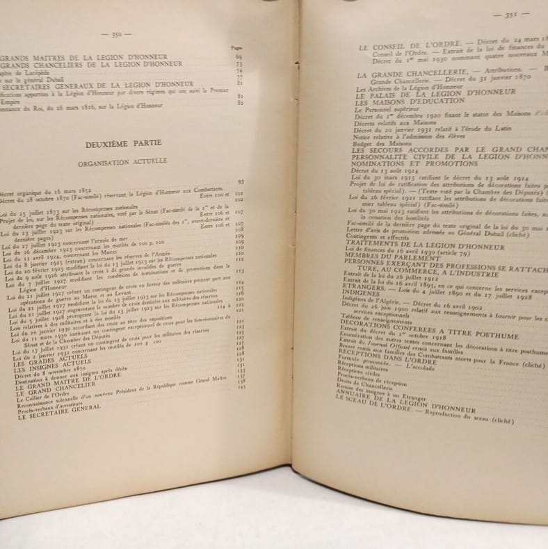 PARIS. LES EDITIONS D'ART "LE DOCUMENT". 1934. GRAND ET FORT IN-4 (26 X 33 CENTIMETRES ENVIRON) DE 355 PAGES, RELIURE DE L'EDITEUR 1/2 CHAGRIN ROUGE, DOS A CINQ NERFS ORNE DE CAISSONS DORES AVEC DECOR DORE DE PALMES ET DE CROIX DE LA LEGION D'HONNEUR, TITRE ET TETE DORES. BEL OUVRAGE ILLUSTRE DE 73 PLANCHES HORS TEXTE DONT PLUSIEURS EN COULEURS ET DE NOMBREUSES REPRODUCTIONS DE BREVETS ET DIPLOMES EN FAC-SIMILE, DECORATIONS, PORTRAITS, TABLEAUX, ETC. OUVRAGE LE PLUS COMPLET SUR LA LEGION D'HONNEUR, SA CREATION, SON HISTOIRE, SON ORGANISATION ACTUELLE. AVEC UN IMPORTANT CHAPITRE SUR LES ANCIENS ORDRES FRANCAIS. (SAFFROY. 4159). BEL EXEMPLAIRE.