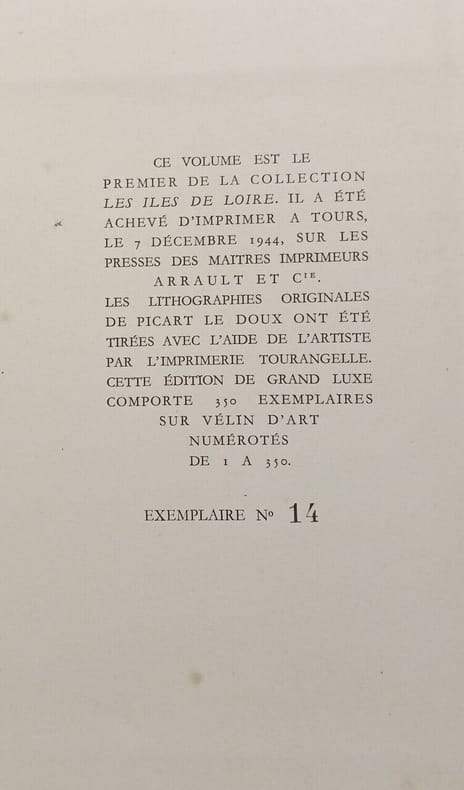 Tours, Les Iles de Loire, s.d. (1944). 1 vol. in-4° br., 164 pp., (1) p., lithographies de Picart Le Doux dans le texte dont plusieurs à pleine page.