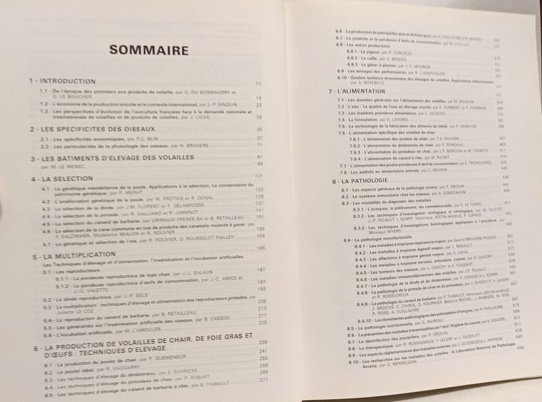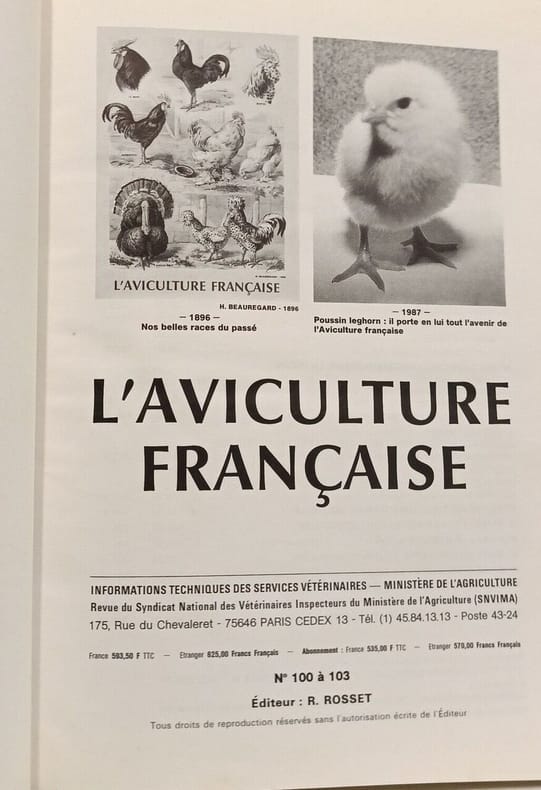 Editions Rosset,1988, numéro 100/103. Important livre sur l'élevage des poules, dindes, pintades, canards, oies avec de nombreuses illustrations, photos en couleurs et en n&b, tableaux, schémas. Les spécificités des oiseaux - Les bâtiments d’élevage des volailles - La sélection - La multiplication - La production de volailles de chair, de foie gras et d’oeufs : techniques d’élevage – L’alimentation – La pathologie – Les aspects humanitaires en production avicole – Ramassage, transport et abattage des volailles – La qualité de l’oeuf – La formation professionnelle en aviculture.