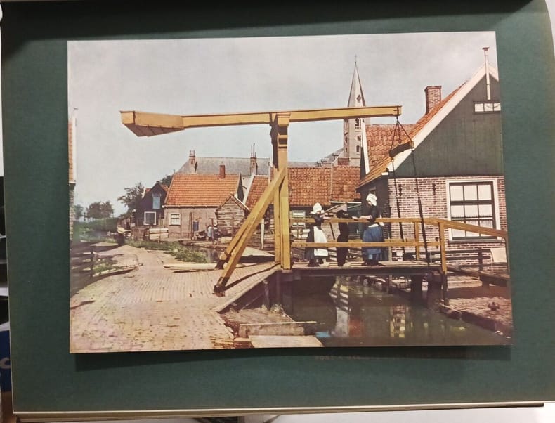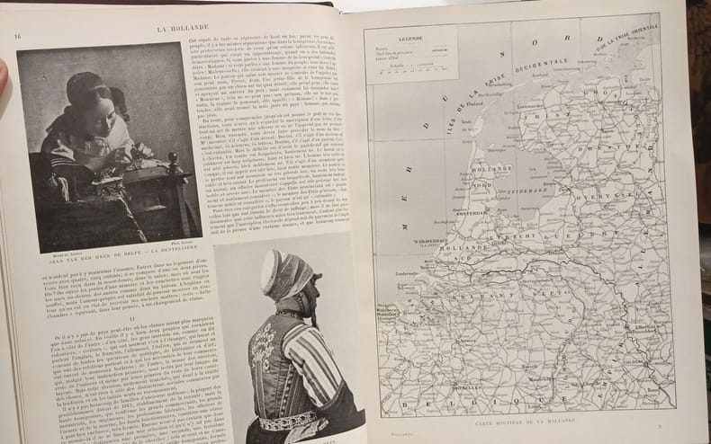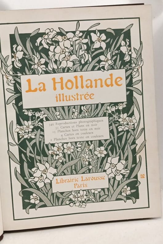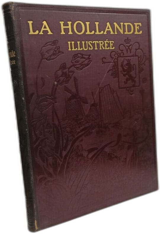 Paris Librairie Larousse sans date (vers 1910) In-4, demi-chagrin vert, plats de percaline verte, premier plat entièrement recouvert d'un décor estampé à froid représentant un paysage hollandais, dos sans nerfs orné d'un grand motif floral estampé à froid; doublures et gardes de papier à motifs floraux, tranches lisses rouges (cartonnage de l'éditeur, signé Engel).Edition originale de ce bel ouvrage illustré de 17 planches hors texte (2 en couleurs contrecollées sur bristol vert et 15 en noir), de 349 reproductions photographiques à pleine page et in texte, et de 39 cartes et plans (35 en noir et 4 cartes en couleurs). Bel exemplaire.