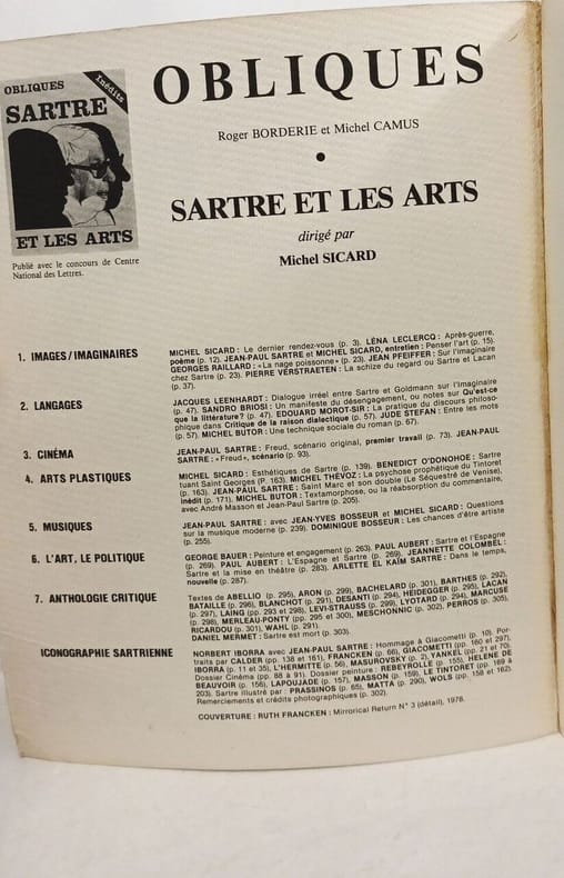 Sommaire : Le dernier rendez-vous - après guerre poème - penser l'art - la nage poissonne - sur l'imaginaire chez Sartre - la schize du regard ou Sartre et Lacan - dialogue irréel entre Sartre et Goldmann sur l'imaginaire - la pratique du sicours philosophique dans critique de la raison dialectique - entre les mots - une technique sociale du roman - esthétiques de Sartre - Sartre tuant Saint Georges - la psychose prophétique du Tintoret etc Classification Dewey : 70.49-Presse illustrée, magazines, revues