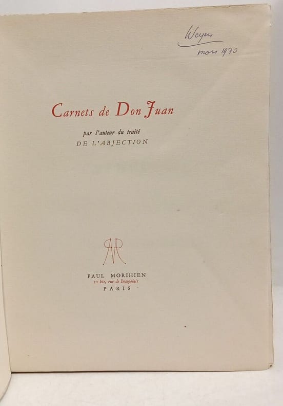 Edition originale ornée d'une lithographie en couleurs de J.C. IMBERT en frontispice. Tirage limité à 1450 exemplaires, un des 1250 sur vélin. On joint les carnets de Don Juan par l'auteur du traité de l'abjection (Jouhandeau). P. Morihien 1947. In-4° tellière broché, sous couverture rempliée. Exemplaire non justifié sur vélin de Condat.