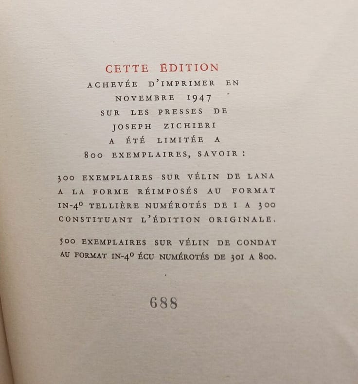 Reliure sous chemise à liens, In 4° tellière numéroté 228/300. Photo sur demande. Un des 300 premiers exemplaires sur vélin de Lana à la forme réimposés au format in 4° Tellière (n°16), et constituant l'EDITION ORIGINALE