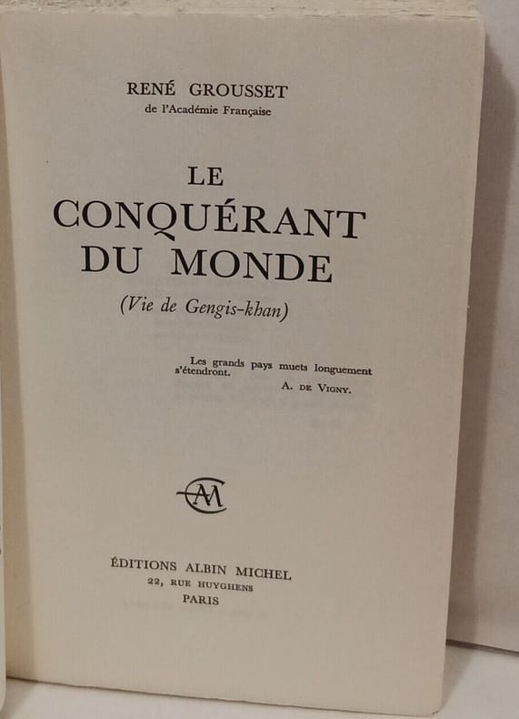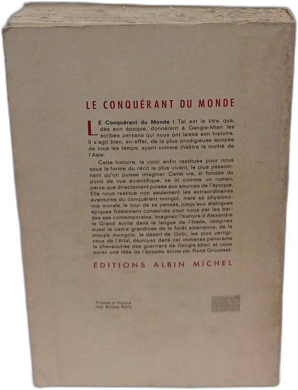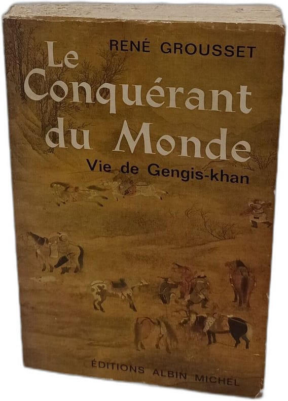 BROCHE CORRECT NOM SUR GARDE PIED EMOUSSER in 8 . 381pp, illustrations hors texte, tableau généalogique et 2 cartes dépliants L une légèrement déchirée , couverture illustrée. LE CONQUERANT DU MONDE (VIE DE GENGIS-KHAN) , GROUSSET RENE Albin Michel, Broché,1944